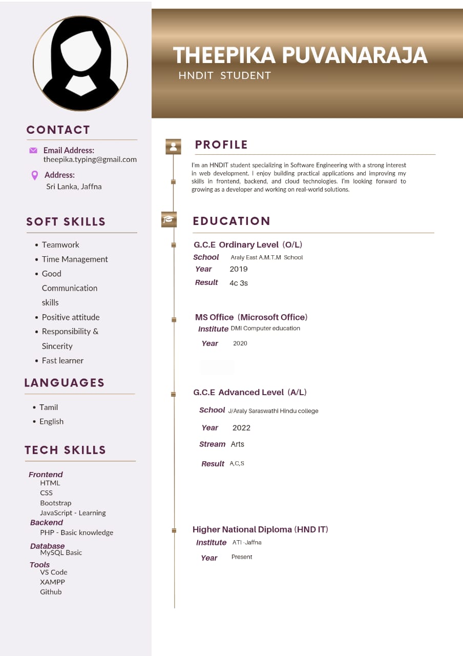 Hello! My name is Theepika Puvanaraja, and I am a passionate Web Developer from Sri Lanka. I am currently studying HNDIT (Higher National Diploma in Information Technology) and working towards becoming a professional Software Engineer. I enjoy creating websites that are simple, attractive, responsive, and user friendly. Web development allows me to combine creativity and technical skills to build useful digital solutions. I am always interested in learning new technologies and improving my development skills